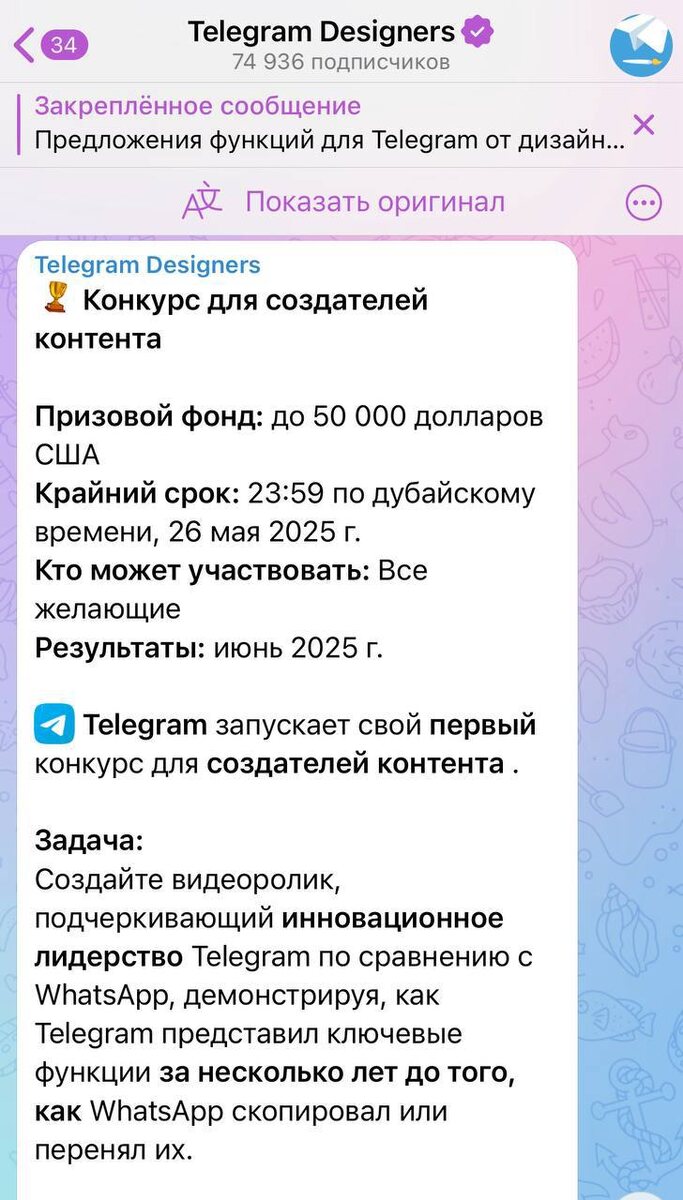 Пять млн рублей – за видео о том, чем Telegram лучше WhatsApp*. Павел Дуров объявил конкурс среди блогеров. Участвовать могут все желающие, главное — искренне рассказать, какой инновационный Telegram. • Весь текст должен быть на английском языке. • Видео менее 180 секунд. • Можно пользоваться ИИ. Оценивать будут по вирусности, дедлайн — 26 мая, результаты — в июне. *принадлежат Meta, признанной в РФ экстремистской организацией. НОВОЕ ПАВЛИНО Прислать новость|Подписаться🎈