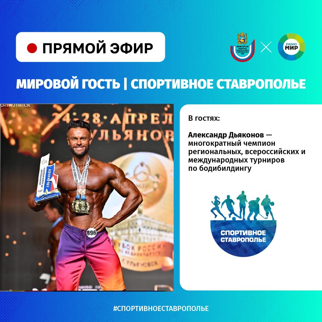 🎬 «Мировой гость. Спортивное Ставрополье»: дубль 29! 💪 Ведущие российские мастера бодибилдинга завершили весенний сезон. В когорту лучших в этом виде спорта входят и ставропольские силачи. Один из них – многократный чемпион региональных, всероссийских и международных турниров, лидер национальной сборной в категории «атлетический бодибилдинг» Александр Дьяконов станет героем очередной программы «Мировой гость. Спортивное Ставрополье». 📅 29-й выпуск совместного проекта министерства физической культуры и спорта Ставропольского края и «Радио МИР-Ставрополь» увидит свет в среду, 21-го мая. ⌛️ Не пропустите прямой эфир с 15:00 до 16:00 на волнах «Радио МИР-Ставрополь»!