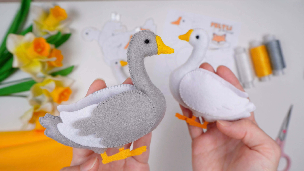 В этом мастер-классе я покажу, как сшить реалистичных гусей из фетра своими руками — гусиную пару, состоящую из гуся и гусыни, которую я создала специально для моей авторской серии “Азбука из фетра”. Именно с этих героев — с буквы «Г» — мы начинаем наш рукодельный марафон по созданию объёмной фетровой азбуки с животными. Это не просто обучающий проект, а настоящая коллекция, в которой каждое животное создаётся с заботой о том, чтобы ребёнок мог воспринимать внешний облик зверюшек как можно ближе к реальности. Гусей мы будем шить из мягкого корейского фетра толщиной 1 мм, который прекрасно держит форму, легко прошивается и подходит для создания игрушек даже маленького размера. Оранжевые лапки и клювы вырезаются из более плотного фетра, что помогает добиться выразительности и чёткости силуэта. В мастер-классе представлены два цветовых варианта — белый и серый гусь, так что вы сможете выбрать подходящий под вашу задумку, либо сшить оба — получится замечательная гусиная пара. Если вы хоти