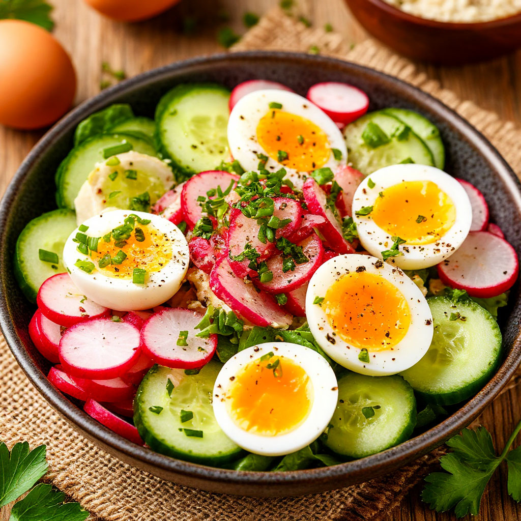 Белковый салат из редиски, яиц и огурцов