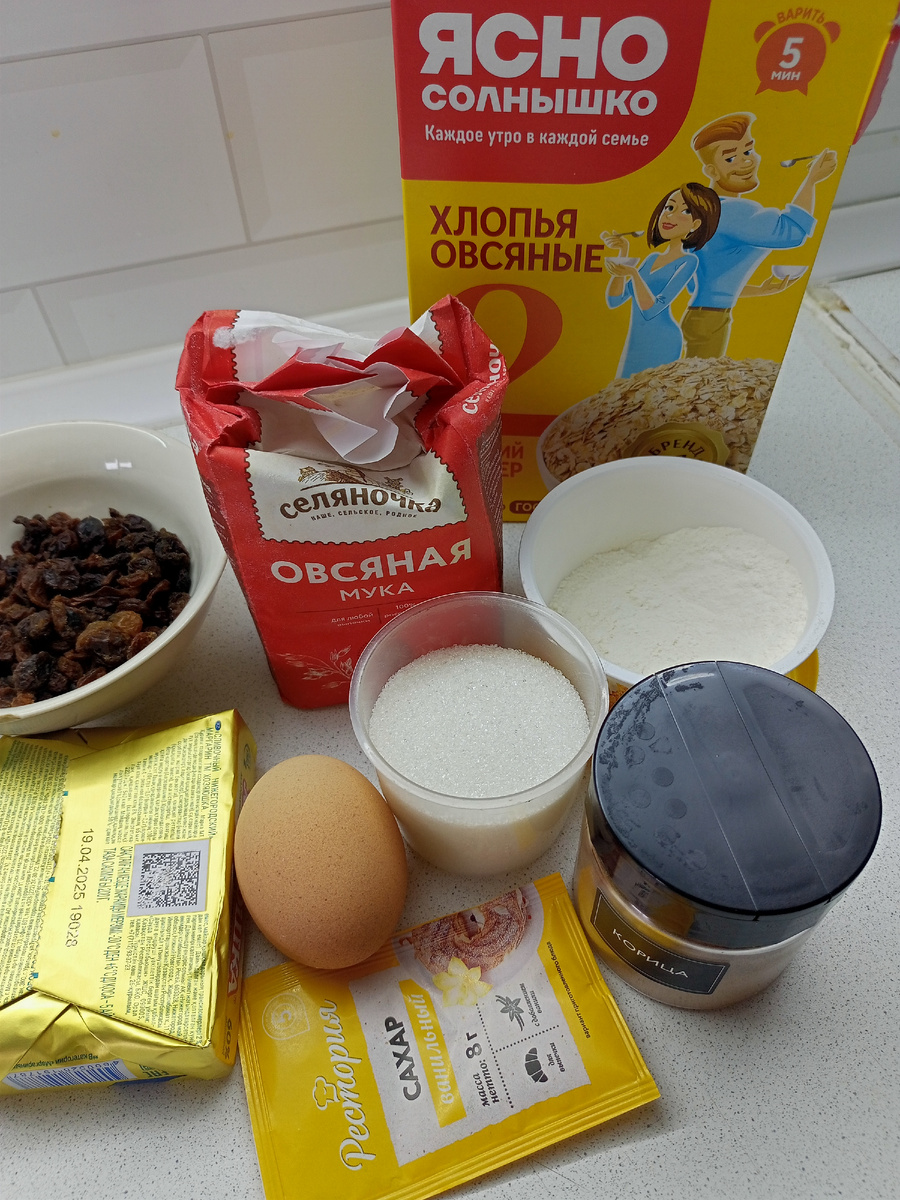 Всем привет ! Вчера пекла овсяное печенье к чаю. Решила поделиться рецептом. Готовится быстро и из простых продуктов . Итак, нам понадобится : 200 грамм овсяной муки ( ее вполне можно сделать самостоятельно из хлопьев), 100 грамм сливочного масла или сливочного маргарина, 60 грамм сахара + пакетик ванильного сахара, 1 ч.л разрыхлителя, 1 ч.л. корицы( не обязательно ) 1 яйцо, щепотка соли, Две горсти изюма( предварительно замочить) Первым делом смешиваем муку с разрыхлителем, солью, корицей и ванильным сахаром. С изюма сливаем воду и пробиваем блендером Масло растопить, добавить сахар и яйцо. Хорошо перемешать. Затем соединяем обе массы, добавляем изюм и, при помощи лопатки, вымешиваем тесто. В процессе замешивания я постепенно добавила три ст.л. цельных хлопьев. Затем, смачивая руки водой, сформировала печенье в виде колобков и выложила на противень, на расстоянии друг от друга. Во время выпечки печенье увеличится в объеме - учтите это! Выпекать в разогретой до 190* духовке 15 мин