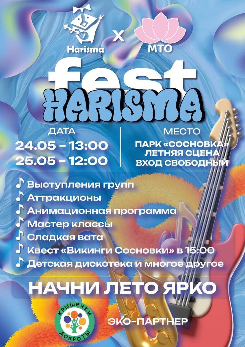 Приглашаю на фестиваль весны в Сосновке! Совсем скоро пройдет музыкальный фестиваль "HarismaFest" с живой музыкой, спортивными играми, сладкой ватой, эко-зона совместно с активистами «Крышечек ДоброТы» и «РазДельного сбора», квестом, аттракционами и дискотекой! 💕 24-25 мая; 💕 Сцена в Парке Сосновка; 💕 Вход свободный!