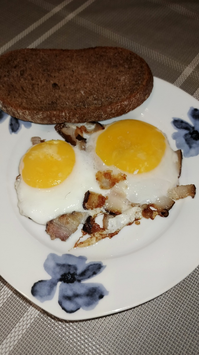Здравствуйте! Я сегодня решила попугать приверженцев ПП и блюстителей чистоты меню. Настроение у меня такое, видимо непогода играет роль. Когда с ночи зарядил дождь, а тебе каким-то чудом нужно доплыть к обеду до работы, не до профитролей. Хочется хорошенько так наестся и никуда не ходить. Увы, я так не могу, поэтому зарядила себя завтраком - страшный сон гастроэнтеролога. У меня в морозилке всегда есть копченое сало и грудинка, домашние. Как правило, я добавляю понемногу в гороховый суп, гораздо реже - ем это на завтрак. Копчености домашнего производства со мной с детства. Отец сам растит животных, сам их разделывает и сам делает такие заготовки, то есть, засаливает и коптит. В моем детстве помню у него в друзьях был местный работник колбасного завода, ныне, как и все остальное, благополучно разорившегося, многому он научил. В общем, домашнее сало есть всегда. И когда на меня накатывает тоска и голод, я могу приготовить себе такой завтрак: поджаренная грудинка, залитая яйцами. Стоит