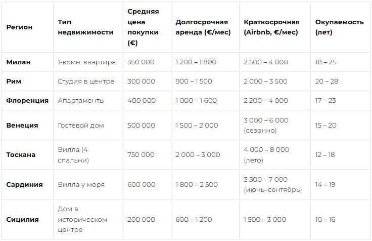 ✔ Покупать в малораскрученных, но перспективных местах (например, Пулья, Калабрия). - Для пассивного дохода → Милан, Рим (стабильная долгосрочная аренда).