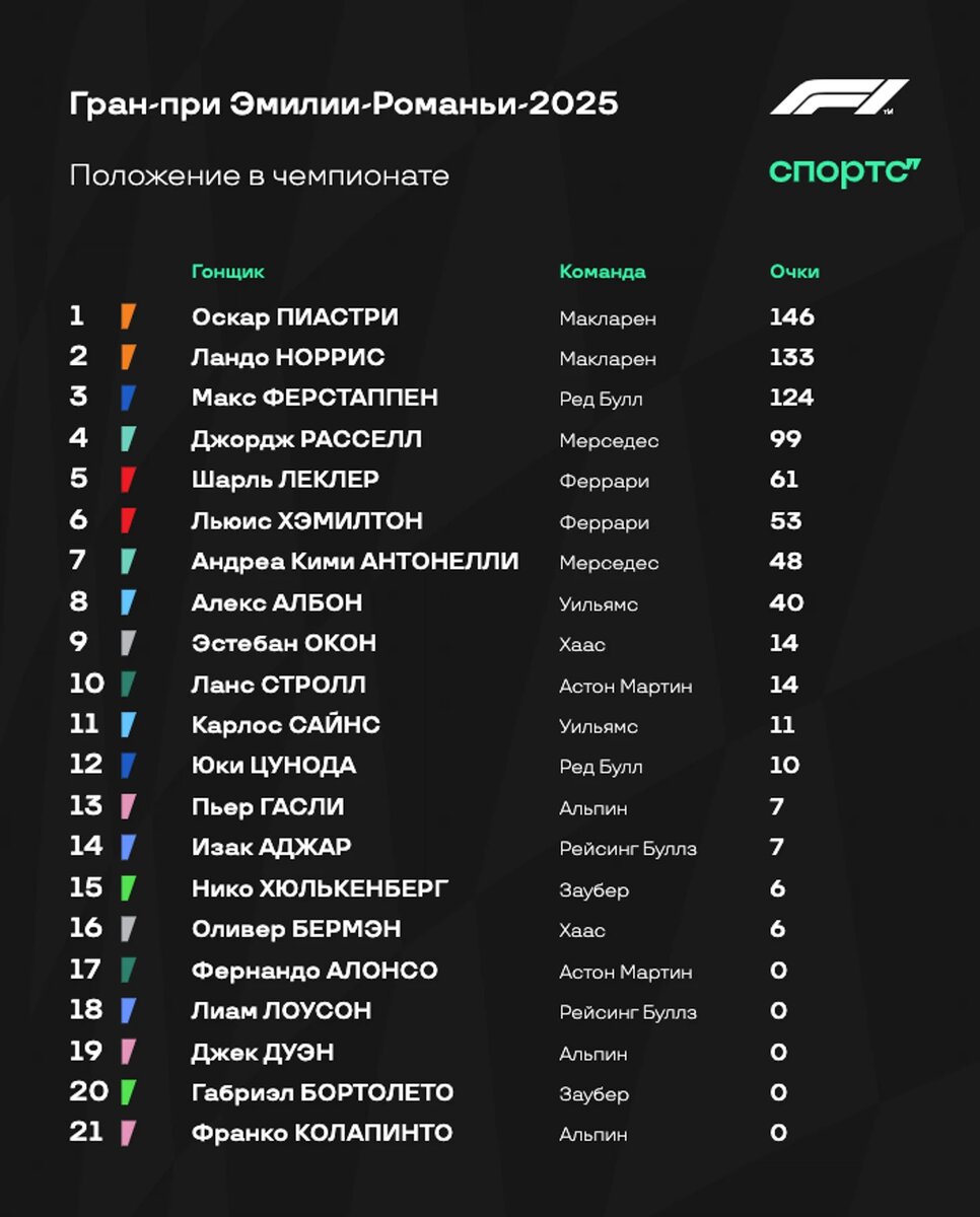 По мнению Фернандо, кто-то из первой пятерки не показал должного перформанса, но все-таки занял высокое место. Топ-5 в Имоле составили Макс Ферстаппен («Ред Булл»), Ландо Норрис, Оскар Пиастри (оба – «Макларен»), Льюис Хэмилтон («Феррари») и Алекс Албон («Уильямс»).