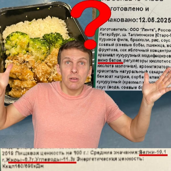 Задачка для диетологов и нутрициологов. Купили готовый ужин от Ленты FRESH!😃🍲 Очень вкусная штука оказалась, Но вот с БЖУ и калорийностью какая-то путаница.🤨 Заявлено, что в 100 г продукта:👇 Белков- 10 г, Жиров- 0,7 г, Углеводов -11,7 г В итоге: 10х4ккал+0,7х9ккал+11,7х4ккал=около 97ккал НО на упаковке написано - 160ккал на 100г. Почему такая разница? 🤨❓ Читаем состав…. а там - вино🍾, которое тоже вносит свою калорийность. Для справки!!! 100г сухого вина содержит примерно 70 ккал, при это в нем нет белков, жиров и углеводов.✅ Как думаете, это все таки вино или в Ленте не так посчитали? Напишите в комментариях.✍️ Вот так, писал пост про еду, а получилось про алкоголь.🤪🍾