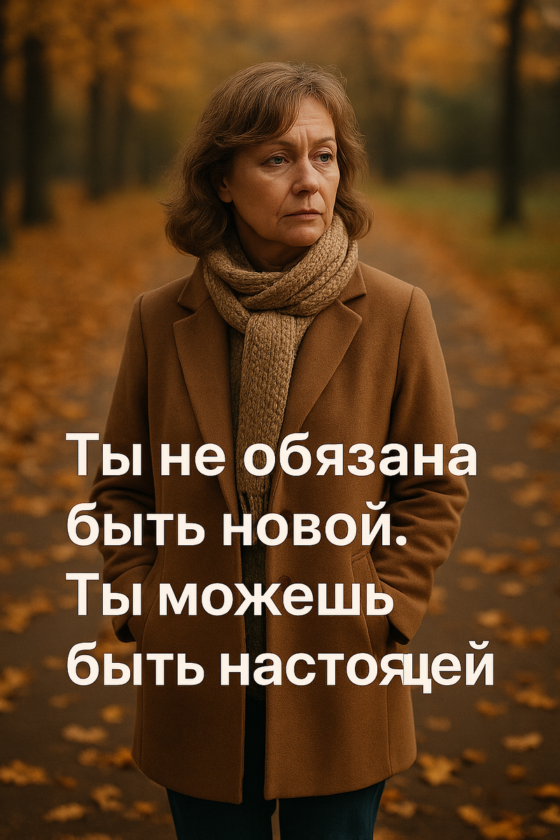 Я не знаю, кто решил, что женщина после 40 должна срочно «возрождаться». Менять мышление. Строить тело. Записывать аффирмации на зеркало. Собирать чемодан на Бали или в Сочи. Улыбаться в Instagram с подписью: «Я снова нашла себя». А если не хочется ничего искать? Если ты не потерялась? Если ты просто устала? Если ты хочешь не «переродиться», а наконец отдохнуть от всего этого давления — быть лучше, ярче, продуктивнее, женственнее? Ты не обязана быть новой. Ты можешь быть — живой. Со всеми своими «не хочу», «не знаю», «не могу», «не сейчас». Потому что с тобой всё в порядке. Даже если ты ничего не хочешь. Вот ты дочитала до третьей статьи. Первая — была про пустоту. Вторая — про то, как ты всю жизнь была хорошей, и тебя за это хвалили. А теперь — настал момент, когда ты можешь перестать быть проектом. Прекратить попытки «починить себя». Перестать гнаться за новым «я». И просто — быть. Твоя ценность не в изменениях. Не в том, сколько ты сделаешь шагов к себе. Не в прогрессе. Ты уже ценна