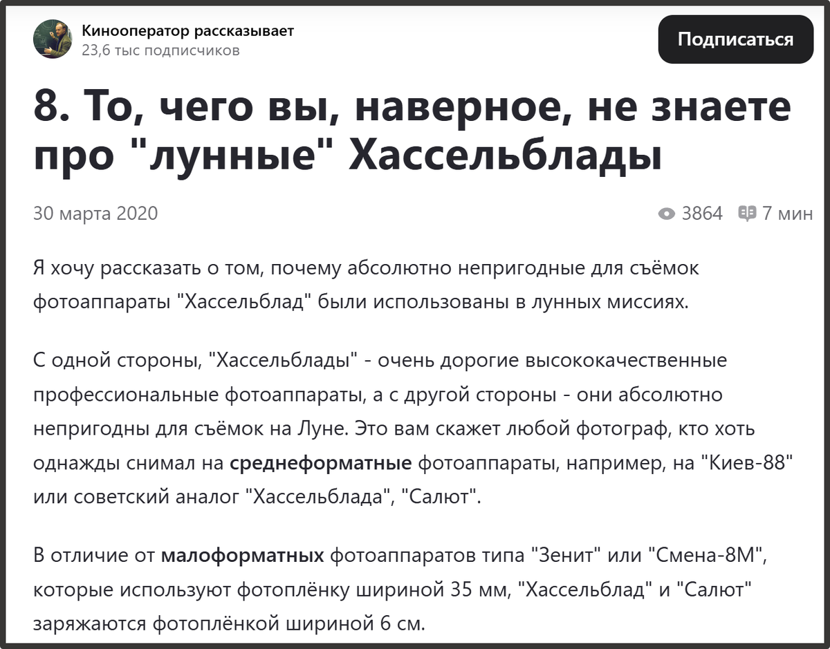 "Итак, существует миф, что кадры "лунных" миссий (квадратные кадры) снимались среднеформатным фотоаппаратом "Хассельблад". Но, по крайней мере, если не половина, то более двух тысяч квадратных кадров из этих миссий точно снималась не "Хассельбладом", а съёмочной аппаратурой с меньшим размером кадра (в другом формате) и с меньшим фокусным расстоянием. Выдумка про "Хассельблады" понадобилась для того, чтобы оправдать небольшую глубину резко изображаемого пространства на "лунных" фотографиях, возникающую при съёмке макетов (нерезкость на переднем плане или на фоне). На самом деле съёмка производилась в павильоне, и для получения дальних планов использовались макеты и куклы. При этом передний план оказался на удалении не 1-2 метра, а в нескольких сантиметрах от объектива, что привело к его нерезкости."