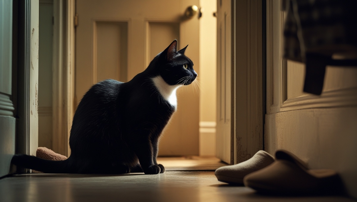 Он сидел у двери, когда я вошёл. Чёрный, как выжженная земля после пожара. С белой полоской на груди, будто кто-то пальцем провёл, оставив след. Он не бросился ко мне, не запищал, не замяукал. Просто сидел. У двери. Уперевшись в неё, как будто мог пробить взглядом толщу металла.