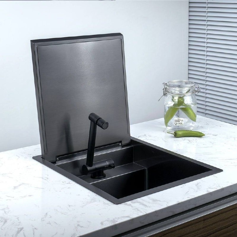 В премиальных кухнях всё стремится к визуальной чистоте. Один из самых эффектных приёмов - скрытая мойка, полностью или частично закрывающаяся крышкой в уровень со столешницей.