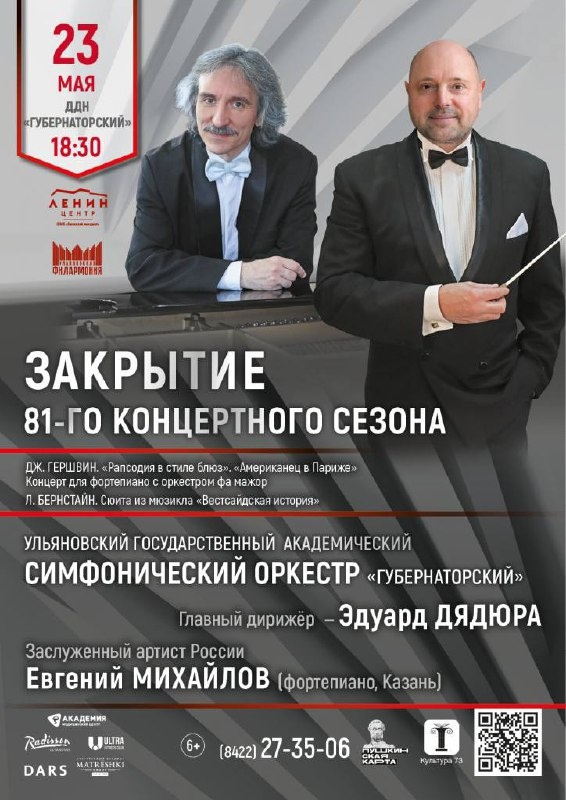 Закрытие 81-го концертного сезона Ульяновской филармонии 🎶 🗓️ 23 Мая в 18:30 📍ДДН "Губернаторский" В программе: Джордж Гершвин. "Рапсодия в стиле блюз" Джордж Гершвин. Концерт для фортепиано с оркестром Джордж Гершвин. "Американец в Париже" Леонард Бернстайн. Сюита из мюзикла "Вестсайдская история" Подробнее Скидка 10% по промокоду культура 💝 #23мая25