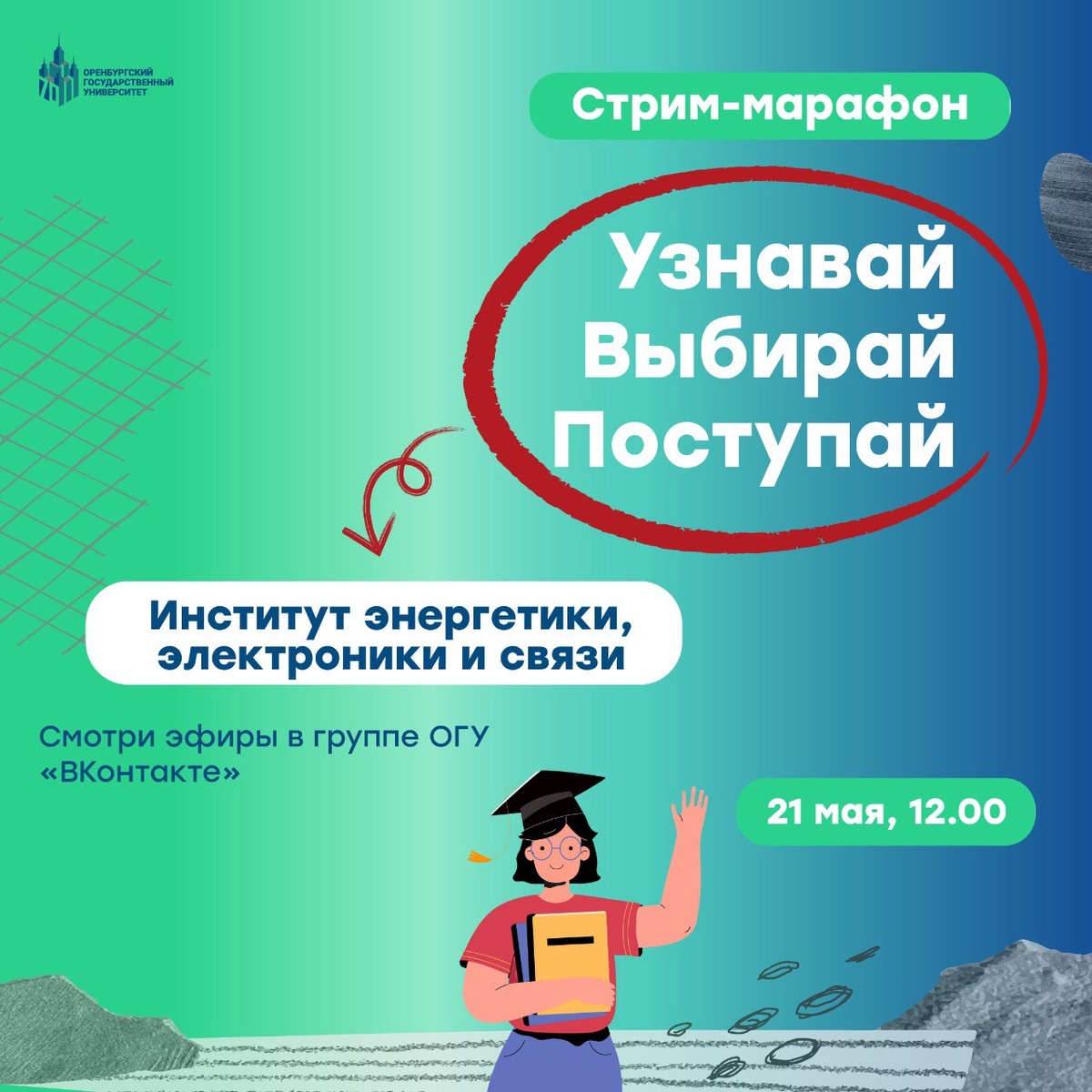 #УзнавайВыбирайПоступай ✅ Стрим-марафон «Узнавай. Выбирай. Поступай» ✅ 21 мая, в 12.00 ✅ Институт энергетики, электроники и связи ОГУ О правилах поступления, особенностях обучения и возможностях дальнейшего трудоустройства расскажет директор ИЭЭС Сергей Митрофанов. Хочешь работать в области электроэнергетики, заниматься проектированием и обслуживанием систем контроля и управления, а также разрабатывать проекты защищенных систем связи? Тогда не пропусти прямой эфир в группе «ВКонтакте» ОГУ ⚡️ #в_ОГУ #ОГУ #OSU #АбитуриентОГУ2025