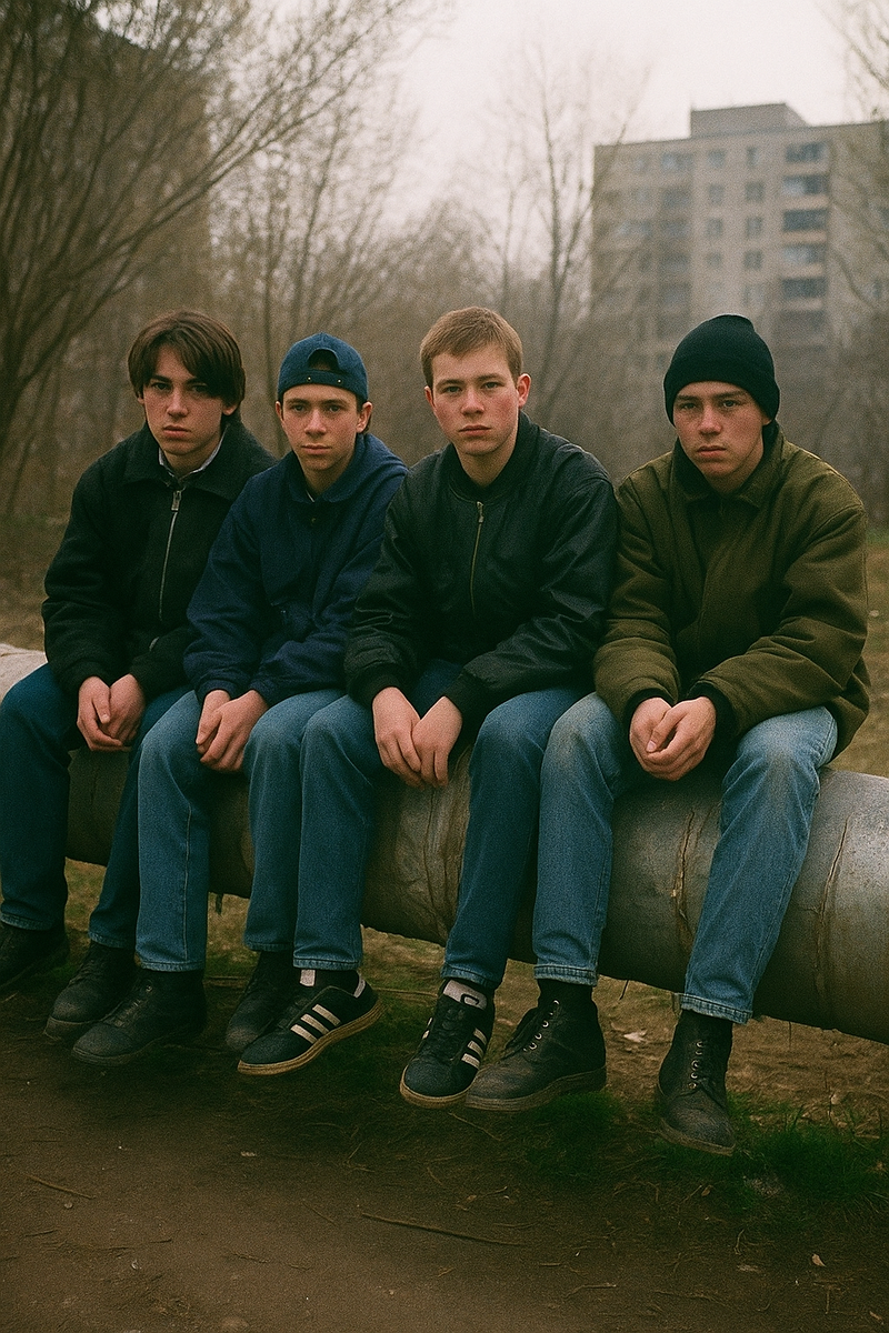 Двор, обнятый туманом. Сухие деревья и панелька на заднем плане будто растворяются в акварельной дымке. Пацаны сидят на трубе как на границе времён — между детством и взрослением. Их лица — как кадры из давно забытого фильма: в каждом — своя история. А над ними — надпись, будто шёпот эпохи: