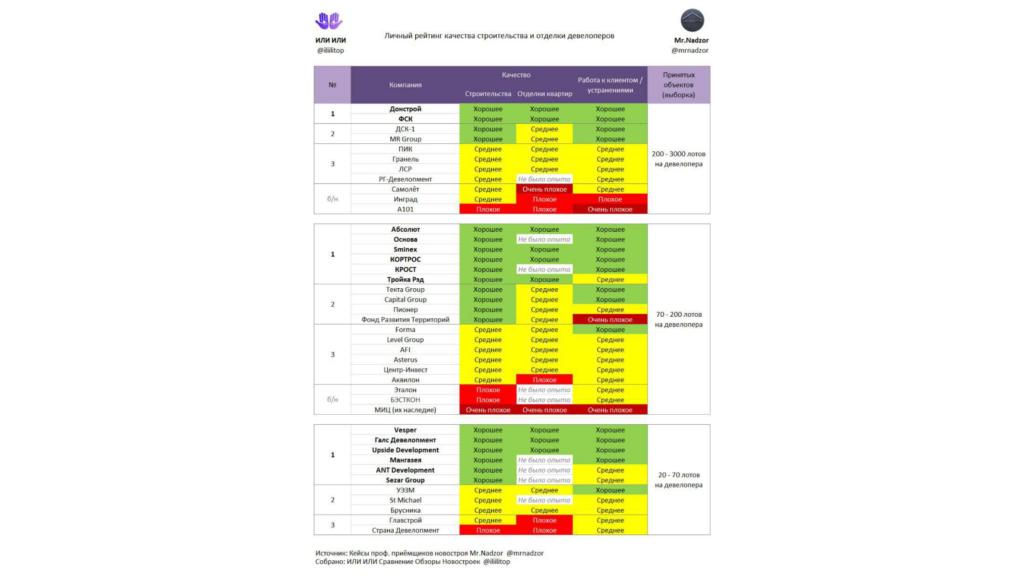 Личный рейтинг качества строительства и отделки девелоперов