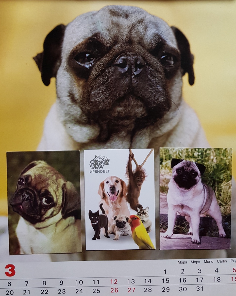 20 мая - день мопсов. Порода очень популярная и поэтому подробно рассказывать о ней не стоит. Происхождением она своим обязана нашим китайским друзьям. Причем предком считают пекинесообразную короткошерстную собаку со звучным названием "Ло Цзе". И как-то повелось что мопсы всегда были компаньонами знати. Попав в 16 веке в Европу, эти комнатные собачки стали вхожи в высшие слои общества, иначе говоря, королевские семьи. И правда, всем своим видом они напоминают этакого важного китайского Мандарина. Признание как породы произошло в конце 19 века, тогда же и приняли стандарт, но свое современное обличие мопсы обрели не так давно. Благодаря энтузиастам кинологам мопс сохраняет свои высокие позиции в мире любителей собак, хотя сложностей в содержании довольно-таки много. И... безусловно, что может оказывать влияние на популяризацию? Естественно распространение изображений предмета обожания. На календариках мопсов можно увидеть частенько))) И я их вам покажу. Не правда ли эти мордашки напом