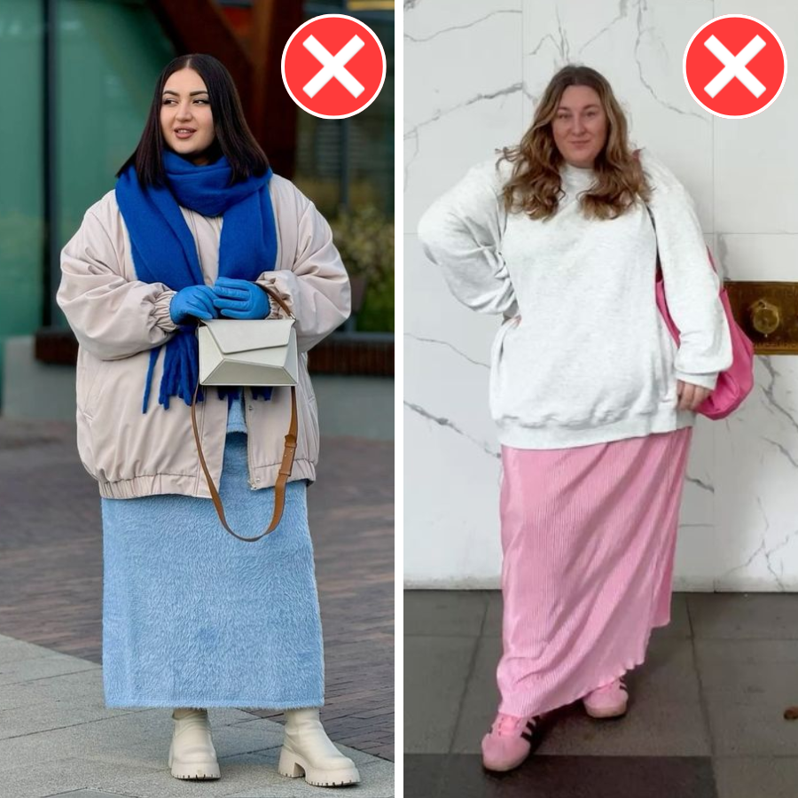 Конечно, когда фигура не соответствует нашим ожиданиям, хочется просто все спрятать. Честно? Я и сама таким грешу. Просто достаю оверсайз свитшот, длинную юбку и завершаю объемной ветровкой. Это проще всего.