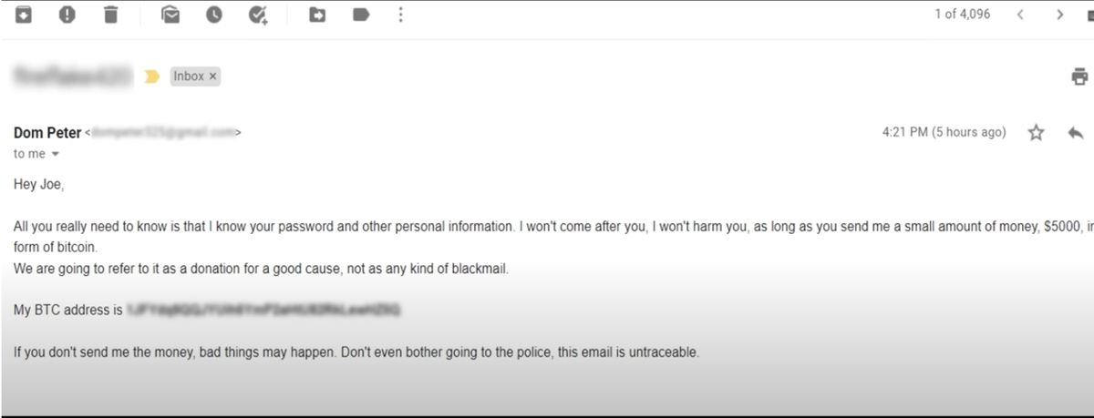 «Привет, Джо. Всё, что тебе нужно знать — я знаю твой пароль и личную информацию. Я не причиню тебе вреда, если ты переведёшь мне $5000 в биткойнах. Считай это пожертвованием на благородное дело. Не пытайся обратиться в полицию — это письмо невозможно отследить.»