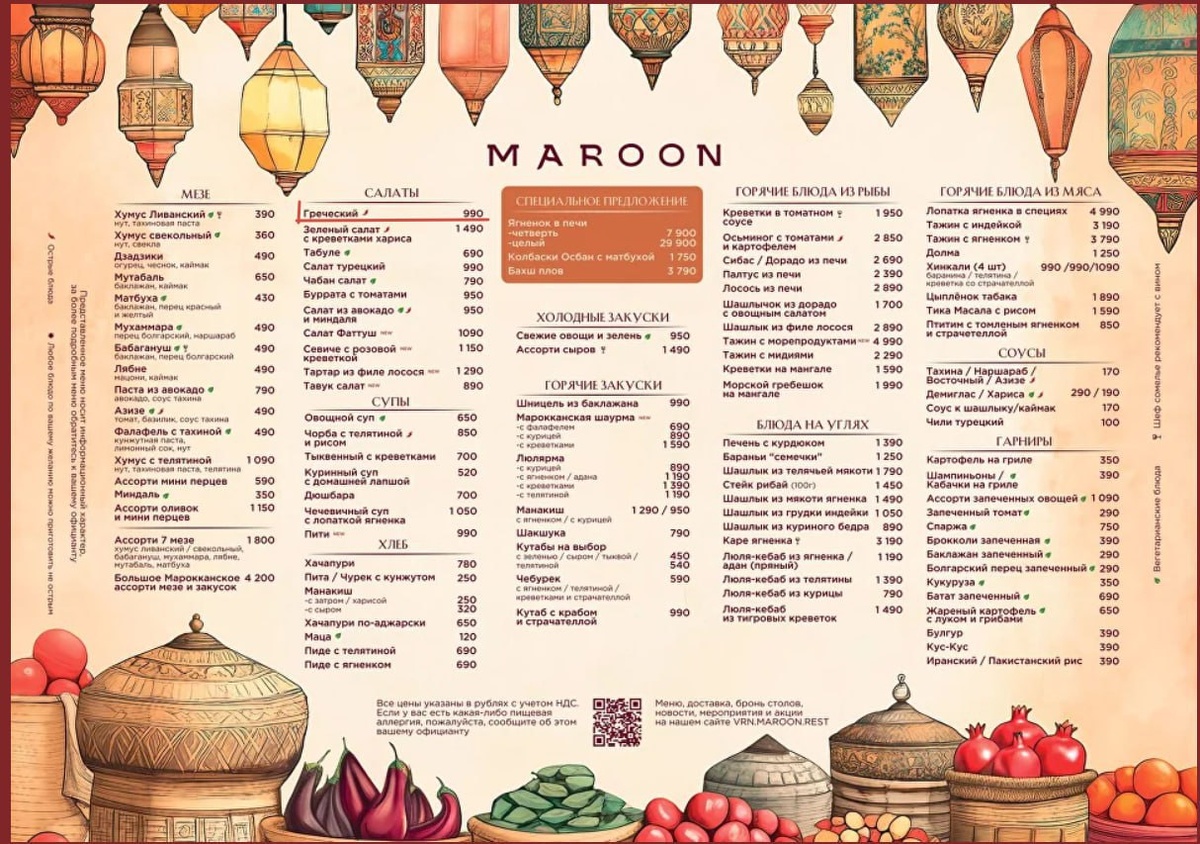Перед открытием ресторана 22 января в распоряжении «Площади» оказалось меню ресторана с весьма высокими ценами. Тогда редакцию особенно удивила стоимость одного из самых простых в приготовлении салатов. Чтобы отведать «Греческий» в Maroon, нужно было потратить 1 590 рублей. За хачапури пришлось бы заплатить 890 рублей, а за чечевичный суп с лопаткой ягненка – 1 190 рублей. Из основных блюд самое дорогое – осьминог с томатами и картофелем (3 800 рублей) и тажин с морепродуктами (4 990 рублей).