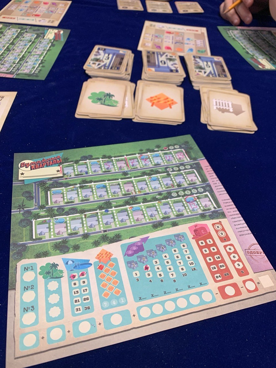 Люблю этот карандашебумаг. Простой, со своими штуками на подумать и с неплохой кризисностью. А всего-то записываем числа на листе. Часто её сравнивают с лото. Сходство конечно есть, но тут всё-таки есть выбор из 3х чисел. Ну и вам нужно не ряд заполнить, а собирать очки за разные штуки "на районе". Стоить парки, бассейны, улучшать стоимость участков и получать бонусы, которые мы собираем с помощью тех же карт. Когда мы выбираем номер, к нему прицеплен какой-то бонус. И ситуация выбора состоит часто в том, что номер нужен тебе вот тот, а бонус вот этот. И думаешь что тебе больше пригодиться. Приятно поломать голову на полчаса. Под конец, когда место на листе начинает заканчиваться, ловишь и азарт (а повезет ли с номером) и кризисность (цена каждого решения увеличивается).