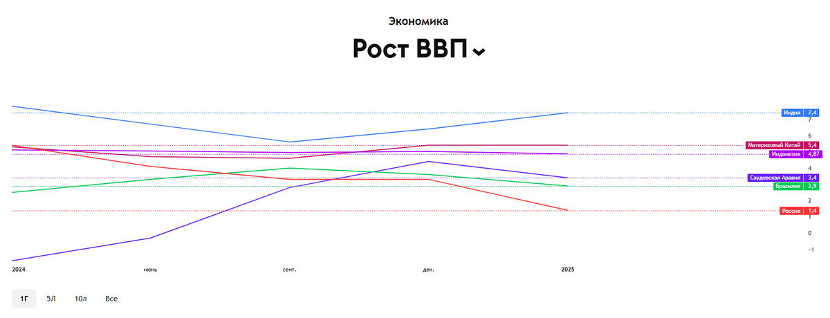 "Отклонение российской экономики вверх от траектории сбалансированного роста уменьшается. Оперативные данные, в том числе во II квартале, свидетельствуют о постепенном замедлении роста внутреннего спроса", - отметил ЦБ. По расчетам Минэкономразвития, в январе-апреле 2025 года ВВП прибавил 1,5% в годовом выражении. Т.е. я правильно понимаю что для ЦБ рост экономики больше 1.5% в год это отклонение от величины желаемого роста? Почему всякие Китаи, Индии и Индонезии стараются увеличить(или сохранить) темпы роста своих экономик, а наш ЦБ всячески этому пытается препятствовать?