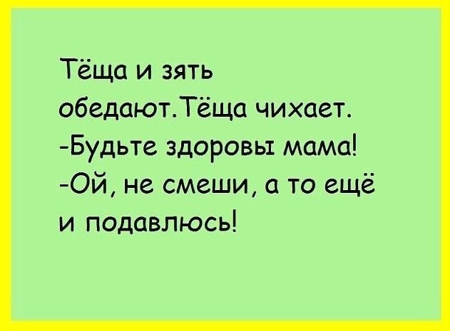 На вокзале зять провожает тещу. Теща – зятю: – Скажи милый, сколько осталось до моего поезда? Зять, глядя на часы: – Один час двадцать две минуты пятьдесят две секунды! * * * Беседуют начальник и подчиненный: – Господин директор! Я хотел бы уйти с работы пораньше на похороны своей тещи. – Я тоже… * * * Теще на юбилей мусорное ведро подарил… Обиделась! – А-а-а, это пустое – по обижается и простит… – Почему пустое?! Полное… * * * Василий Иванович возвращается из отпуска. Петька: – Ну, как дома? – Спасибо, хорошо. Все живы, здоровы. – Теща как? – С тещей вообще прекрасно. Вчера картошку чистила, палец порезала. Пришлось пристрелить, чтобы не мучалась. * * * – Хочу обрадовать тебя, Катюш, – обращается отец к дочери, – Андрей попросил у меня твоей руки. – Да, но мне так не хочется разлучаться с мамой… – И не надо, радость моя! Возьми ее с собой! * * * Разговаривают англичанин, итальянец и русский, о том, кто каким способом предпочтет избавиться от тещи. Англичанин гов