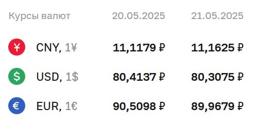 📉 ЦБ обновил официальный курс валют на завтра: 💵 — 80,3075₽ 💶 — 89,9679₽ 💴 — 11,1625₽ Указ об обязательной продаже валютной выручки экспортерами продлен на год #курсывалют