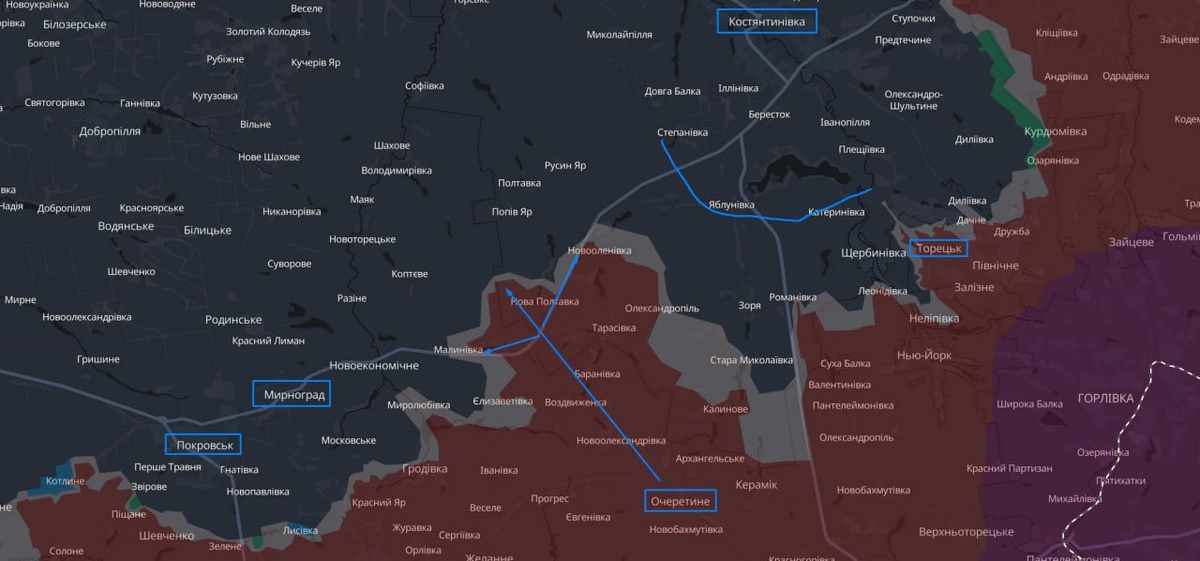 Вторая важная задача, которую решает сейчас российская армия на оперативном уровне — это «закрас» кармана между этим вклинением и Торецком, который ВСУ удерживали ещё со времён «битвы за Авдеевку». Думаю, даже без гифок с динамикой видно, что фронт почти выровнен. Впрочем, тут очевидна задача выхода хотя бы на линию Степановка-Яблоновка-Катериновка\Клебан Бык или даже сразу за них на окраины Константиновки. И так же в противоположную сторону захват большого села Новоэкономическое будет означать выход на восточные окраины Покровской агломерации.