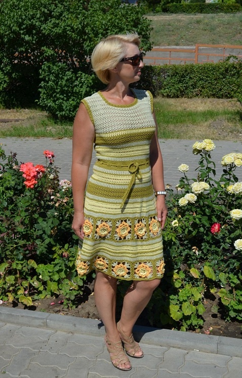 Платье было связано в 2016 году и описание вязания было опубликовано в журнале "Ксюша. Для тех, кто вяжет" в 2019 году. Платье достаточно яркое, для молодых и стройных. Мнения о нем мне писали самые противоречивые: от "очень нравится", до "очень не нравится" Конечно же, его можно связать однотонным. Но на тот момент мне захотелось сделать его именно таким. Захотела - сделала. Делюсь. В описание входит: схемы узоров, расположение узоров и схема смены цветов. Описание не является попетельным и не привязано к определенному размеру или пряже! Рассчитано на умеющих вязать крючком. Для вязания платья «Цветочная полянка» потребуется пряжа «Диа Фине», Сеам, Италия. Состав нити: 45%хлопок, 15% лен, 40% вискоза, 50гр-170м. Но можно взять любой хлопок или нить смесового состава подходящую по метражу и толщине. Платье весит примерно 450гр, размер 44. Распределение цветов можно сделать совершенно любое, как душе угодно! Я ориентировалась на наличие имеющихся у меня моточков. Цвета: темно-желтый, ли