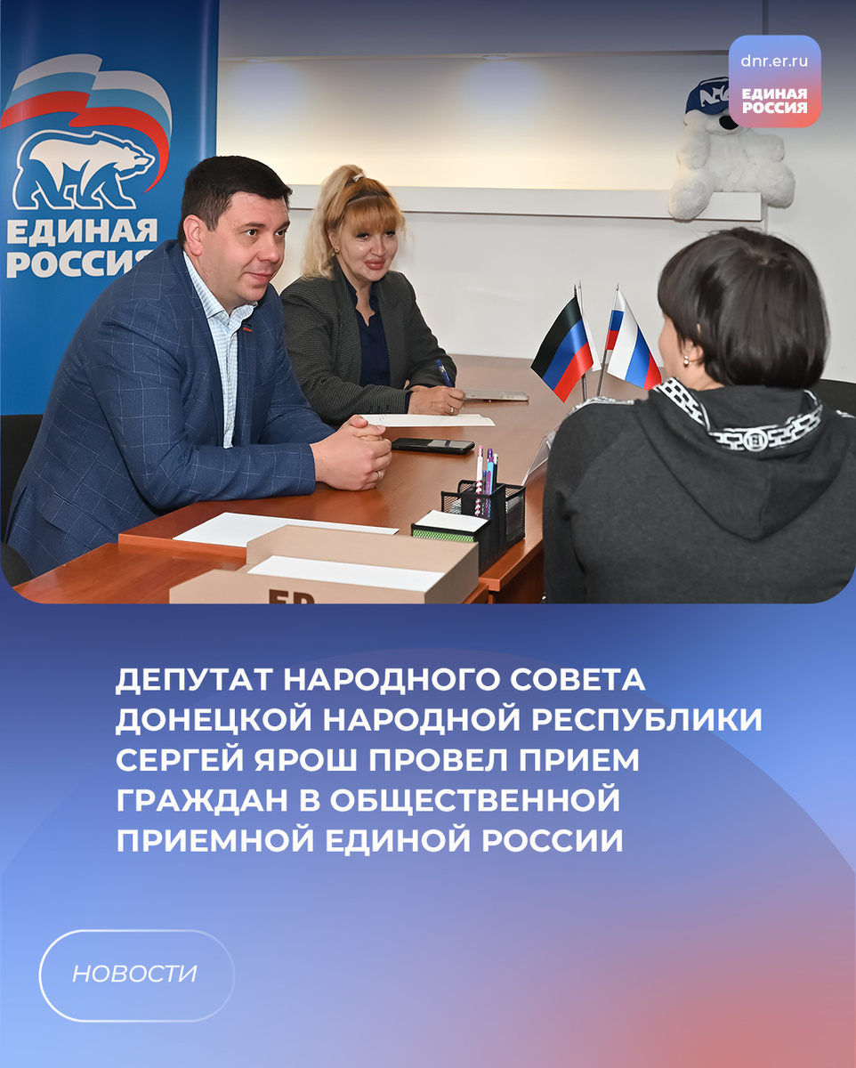 👍В региональной общественной приёмной Единой России прошёл приём граждан. Его провёл депутат Народного Совета ДНР, председатель Комитета по образованию, науке, культуре и делам общественных организаций Сергей Ярош.