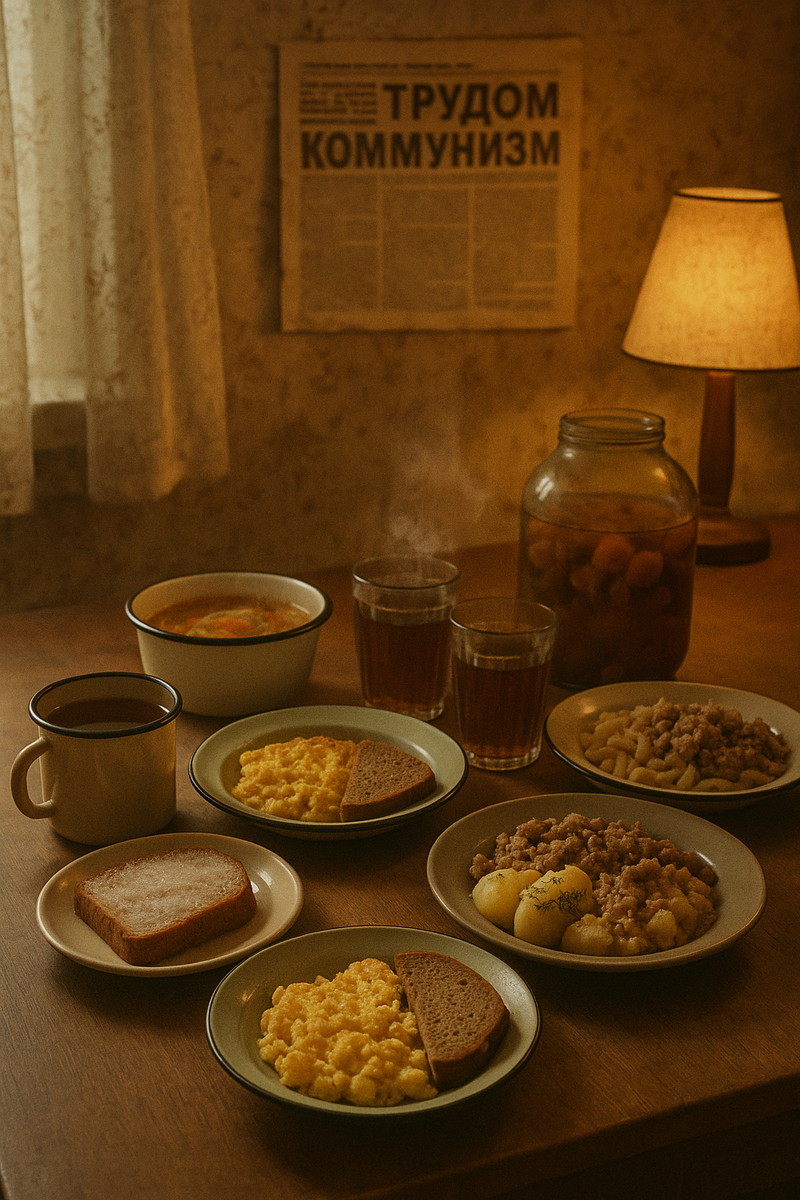 Когда пища была простой, но душевной. Когда запах щей звал с улицы, а кусок хлеба с сахаром был слаще конфет. Есть запахи, которые мгновенно возвращают нас в детство. Шорох щей на плите, сковородка с омлетом под крышкой, компот из сухофруктов — всё это не просто блюда. Это наша история. Это кусочек времени, когда жизнь была другой — пусть и не всегда лёгкой, но настоящей. Сегодня я приглашаю тебя прожить один обычный день из эпохи СССР. День, когда мы ели без глютен-фри, подсчёта калорий и модных приправ. Ели просто. Но вкусно так, что до сих пор помнится. Яйца — 5 шт. Молоко — 150 мл Соль — по вкусу Масло сливочное — 30 г Чёрный хлеб — 5 ломтиков Масло для хлеба — немного Чай (чёрный, заварной, без изысков) Взбивали яйца с молоком вилкой — без миксера. Выливали на сковородку с маслом. Накрывали крышкой и томили до пышности. Не переворачивали. Пара ломтиков хлеба с маслом — и завтрак готов. Чай — крепкий, простой, из заварника, который кипел на плите. Иногда с мятой, если бабушк