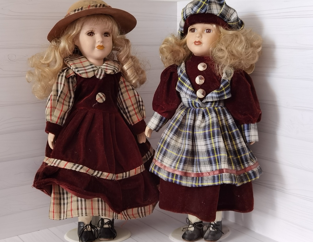 Появились в моем куклодоме еще две девочки. Новенькими их не назовешь, потому что им лет уже... нормально так лет. Они жили у одной девочки, которая решила устроить расхламление в своем доме и куклам там места уже не нашлось. Хорошо, что у меня есть неравнодушная племянница (подруга той девочки), которая, узнав о неопределенном будущем кукол, написала мне в ватсапе: "Возьмешь?". Ну ясень пень - возьму! И вот, новые старые девочки (или дамы?) приехали ко мне! К чести бывшей хозяйки, надо сказать, что куклы прибыли в неплохом состоянии. Видно, что это были интерьерные куклы - украшение комнаты; не игранные, в родных аутфитах. Одежда целая, только резинки на носочках и панталонах растянуты от времени, и шляпа потертая сверху (в анфас этого не видно). Обувь родная и целая. Куклы мягконабивные, с фарфоровыми частями тела, на подставках. Паричковые. Волосы синтетические и видно, что их никто не трогал. И не мыл. Или мыл, но давно. Девочки - почти близняшки. Отличие только в цвете помады на