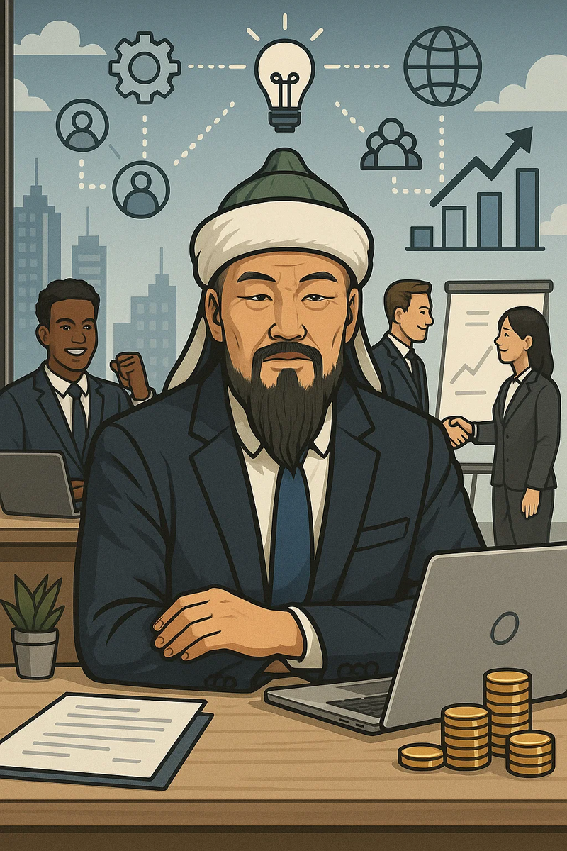 Представь, как бы Чингисхан действовал в современном мире, особенно без насилия, — через его ключевые качества: стратегическое мышление, способность объединять разные народы, гибкость, дисциплину, умение адаптироваться и стремление к глобальному влиянию. Перенос этих качеств в мир бизнеса даёт вполне реалистичную картину того, каким мог бы быть "современный Чингисхан". Вот как он мог бы построить свою "новую империю" через бизнес в XXI веке: Чингисхан умел использовать лучшие технологии и идеи покорённых народов. Сегодня он бы начал с инвестиций в IT, искусственный интеллект, блокчейн, беспилотники и инфраструктуру связи. Вместо завоеваний — альянсы и венчурные фонды. Он бы: У него была чёткая идеология — власть закона ("Яса"), равные возможности, быстрые решения. Сегодня он мог бы продвигать: Современная власть — это информация. Чингисхан бы не стал завоёвывать города, он бы: В прошлом — влияние через язык и законы. Сегодня — через медиа и бренды: Чтобы "Империя" выжила в XXI веке, ну