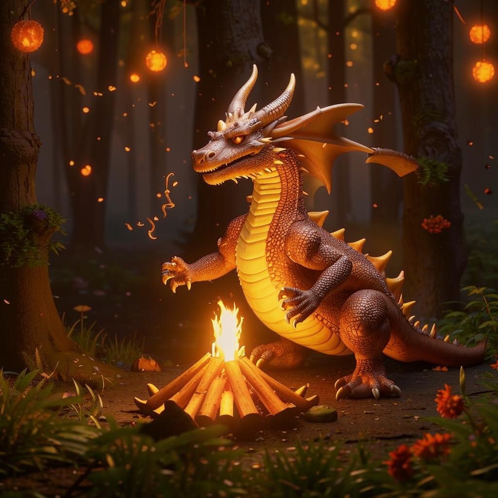 Когда стемнело, Фырк разжёг огромный костёр. Дети жарили зефир, слушая истории дракона о том, как он однажды спалил хвост, пытаясь испечь торт.