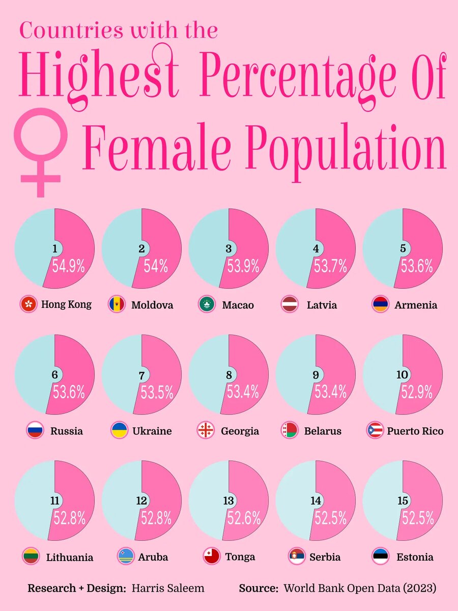 Во всем мире женщины составляют почти половину (49,7%) населения земного шара. Но в некоторых странах баланс заметно смещен в сторону женщин. Фактически, в ряде стран и территорий численность женского населения превышает 53%, что является значительным демографическим перекосом. Эта визуализация показывает 15 стран с самым высоким процентом женщин, на основе самых последних доступных данных Всемирного банка. Где женщин больше, чем мужчин