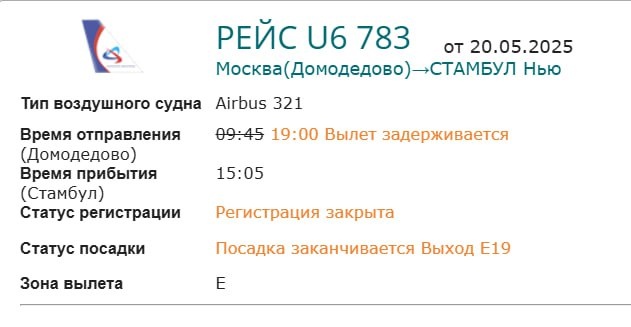 Больше 9 часов не могли улететь туристы в Стамбул из Домодедово. Первоначально рейс U6 783 “Уральских авиалиний” должны были отправить в 9:45, но затем вылет перенесли на 13 часов. Этим задержка не ограничилась: “Мы с утра в чистой зоне. Предупреждение об изначальной задержке пришло в 7:55, когда практически все пассажиры уже были в аэропорту. Затем сдвинули на 16:00, 17:00… Последний был на 18:30. Примерно за час до этого объявили посадку, люди выстроились в очередь, но к назначенному времени опять ничего не произошло. Никаких объявлений нет, автобус за нами тоже не приезжает. Стоим возле гейта. Представители авиакомпании за весь день не связывались с пассажирами для разъяснения причин. На горячей линии также ничего внятного не говорили”, - сообщил Крыше ТурДома один из пассажиров. За время ожидания туристам предоставили воду и компенсацию 600 руб на питание. На борту самолета пассажиры в итоге оказались только в 19 часов. Сейчас Airbus A321, который судя по данным Flightradar с ве