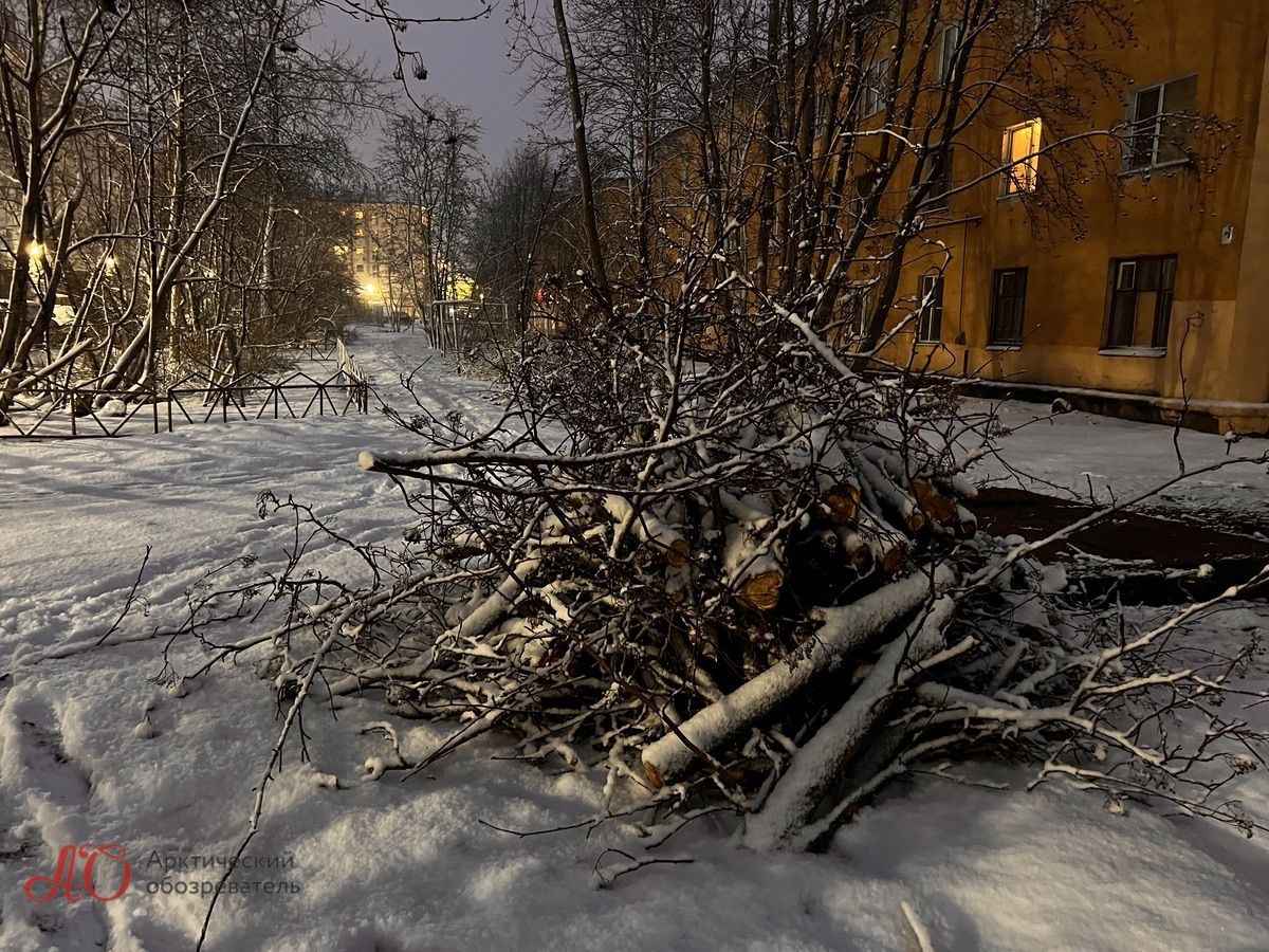 #ГородскиеВторники на ❄ «Арктическом Обозревателе» завершу, пожалуй, постом из своего двора. Вот уже как месяц (если не больше) прошёл с той поры, как во дворе попилили деревья. Действительно, некоторые из них нуждались в обрезке – где из-за старости, где из-за постоянных разрытий грунта в поисках прорывов труб. И эти деревья были помечены красной краской. Каково же было удивление жильцов, когда в один прекрасный момент во двор пришли неустановленные работяги и начили пилить стволы рябин и берёз. И пилили они «строго как попало», потому как после их «работы» деревья с красными отметками остались стоять на месте. Зато здоровые и вполне живые были уничтожены. Мало того, эти уничтоженные деревья, как и написано в начале публикации, до сих пор не вывезены с палисадника. В этой связи, у меня пара вопросов: – какой 😠😡🤬 согласовывал работы по обрезке и в чём причина того, что работы проводились без старшего? По словам жителей, работяги просто ответили «нам сказали пилить – мы и пилим».
