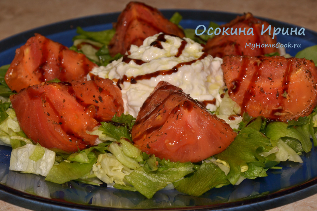 Смешала порезанный "Айсберг", порванный латук и рукколу, сбрызнула оливковым маслом, промешала и выложила на тарелку. В сковороде разогрела оливковое масла, припорошила дно сушеным базиликом, поверх разложила 2 очищенных от шкурки помидора четвертинками и обжарила со всех сторон, затем переложила кругом на салат в тарелке, присолила, на середину тарелки выложила сыр "Страчателла", сбрызнула всё оливковым маслом и бальзамическим кремом и сразу подала. Бесподобно вкусный получился салатик) Приятного аппетита