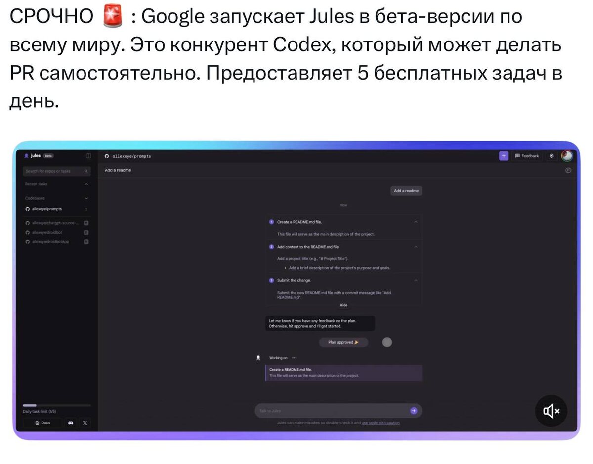 По аналогии, как понимаю, с Codex гугл выпустил своего агента - Jules Очень интересно попробовать, как минимум и сравнить Ну и немного моих мыслей из области шизы: Насколько быстро они могли с 0 написать агента такого же формата? Очень интересно как так вышло, что за короткий срок был выпущен Jules после Codex, даже учитывая то, что никто до конца не уверен был как будет выглядеть SWE агент от OpenAi В целом моя версия, достаточно поверхностная, что в oai какой-то бывший сотрудник мог просто слить информацию Насколько это корректно? Не мне решать. Но кажется достаточно странным такое совпадение К гуглу только позитивное отношение, их модели великолепны а темпы просто поражают, но все таки это не дает мне покоя