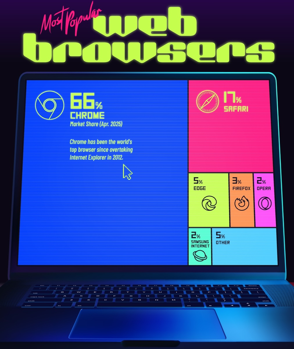 С момента запуска новаторского браузера Mosaic в 1993 году, просмотр веб-страниц стал вратами практически ко всему в интернете. С ростом доступа к интернету во всем мире, использование браузеров значительно изменилось со временем, при этом новые, более быстрые браузеры постепенно вытесняют старые. Эта инфографика демонстрирует самые популярные браузеры по доле рынка в 2025 году, используя данные StatCounter. Доля рынка основана на доле от общего количества просмотров страниц, обслуженных каждым браузером по состоянию на апрель 2025 года. Доминирование Google Chrome