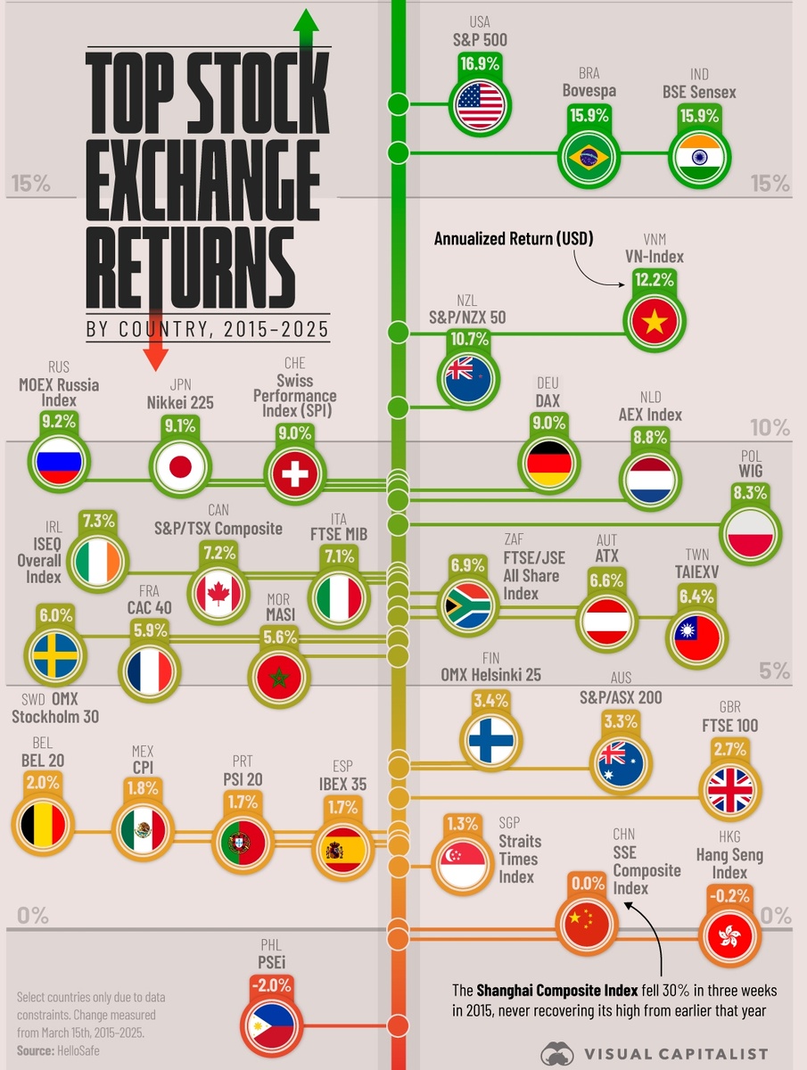 Однако основные индексы Бразилии, Индии и Вьетнама также показали доходность в диапазоне 12–16%. Думаете о том, чтобы стать настоящим глобальным инвестором с инвестициями по всему миру? Задумываетесь, на какие финансовые рынки выйти в следующий раз? Эта диаграмма, которая визуализирует годовую доходность (в долларах США) с 15 марта 2015 года по 2025 год по основным фондовым биржам в 30 странах, содержит некоторые интересные данные. Данные взяты из HelloSafe, канадской платформы для сравнения страховых услуг. Лучшие фондовые биржи по доходности с 2015 года