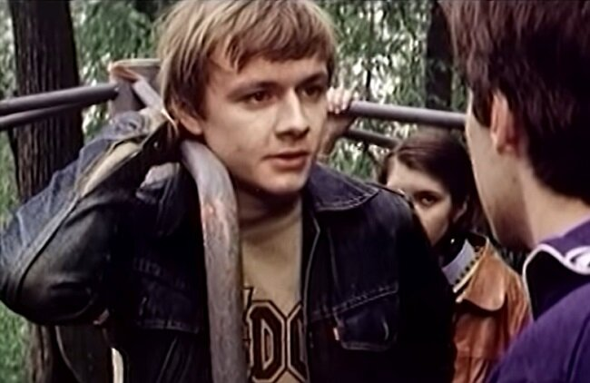 Вот характерная для общей трактовки образа сцена. Николай сидит в своей комнате, снизу доверху увешанной рекламными плакатами западных «поп-идолов». В одной руке у него — книжка на английском языке (парнишка-то не без способностей!), в другой — заграничный ножичек с выдвигающимся лезвием. На лице шаловливо блуждает самодовольная улыбка…