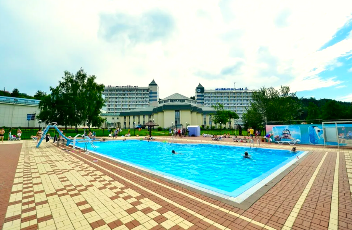 Что приятно удивляет — это дополнительные возможности. Здесь есть большой бассейн с минеральной водой, место для расслабления, теннисные площадки, и даже зимой есть чем заняться — можно покататься на коньках или лыжах прямо на территории.