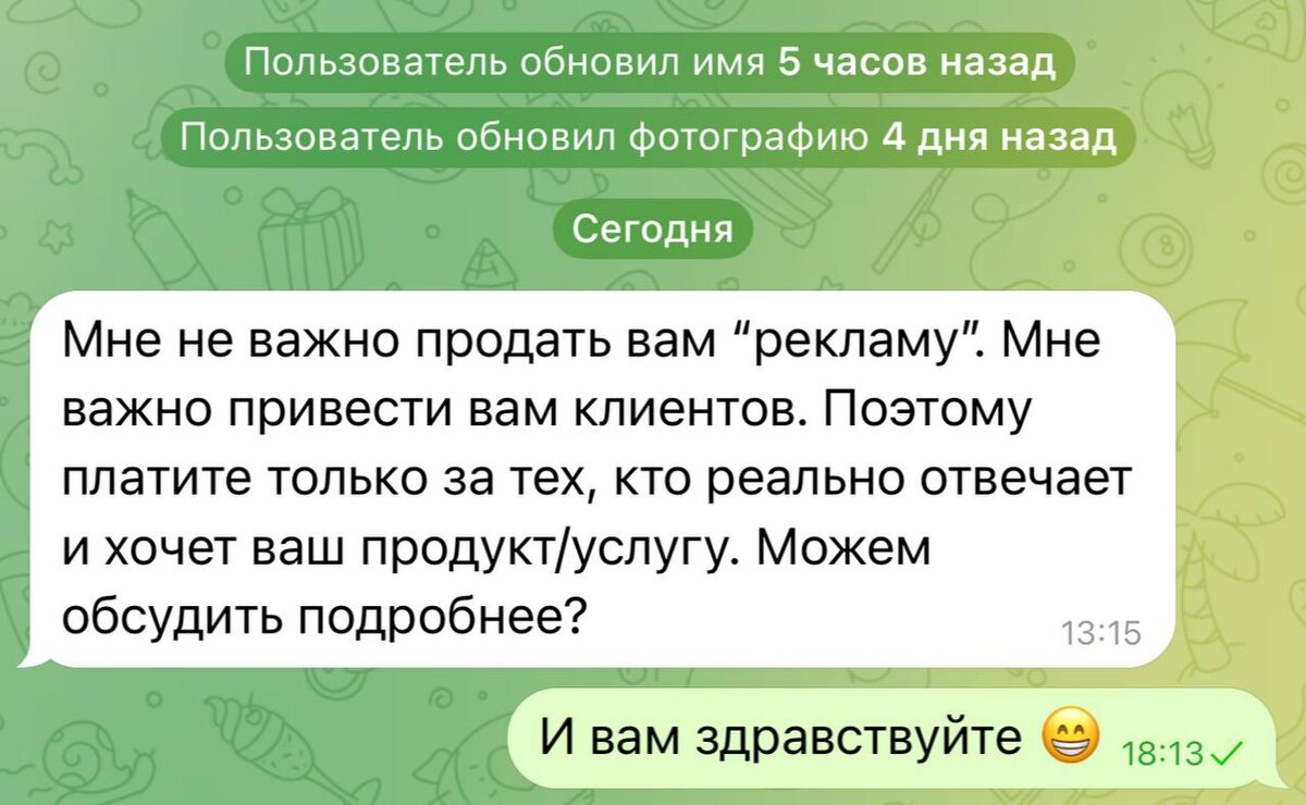 Знаете, я долго думала, про что особенно легко рассказывать мне, и что явно нужно знать другим специалистам. И подобные сооьщения, как в скрине, я получаю часто. Думаю, буду делать разборы, как не надо писать, почему и альтернативу. Я - не копирайтер, я маркетолог и хороший продажник, с прекрасными навыками эффективных коммуникаций. И подобные «предложения» не просто режет глаз, а хочется кричать «как? КАК вы можете помочь мне, если не можете помочь даже себе. Если не знаете этапов знакомства, вовлечения, хотя структуру первых сообщений🤦🏼♀️» Стоило принять решение делиться своим опытом, как темы сами идут ко мне) Интересно узнать о структуре продающей переписки, можно ли продавать с первых сообщений и если да, то как?