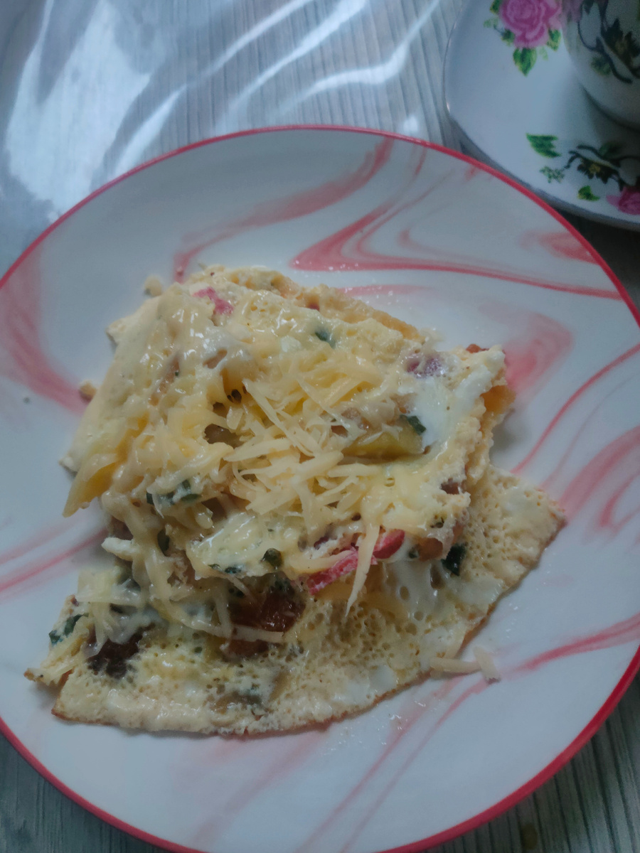 Завтрак. Вспомнила, как мамочка часто в печке готовила омлет с картофелем, с румяной корочкой. Вот сегодня что - то наподобие решила сделать на завтрак, в холодильнике осталось чуть - чуть жареного картофеля, я никогда не выбрасываю продукты, вот и решила пустить картофель в омлет. Получилось вкусно. Правда, готовила на сковороде. Готовый омлет сверху присыпала сыром.