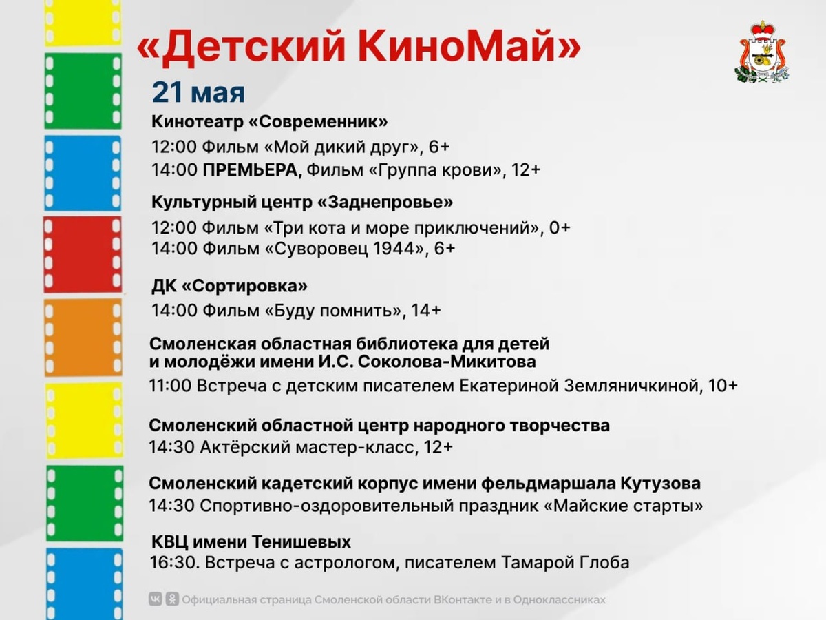 С 20 по 24 мая в Смоленске проходит Благотворительная КиноНеделя«Детский КиноМай», которая дарит юным зрителям и их семьям возможность бесплатно посмотреть лучшие российские фильмы, пообщаться с известными актёрами, режиссёрами и писателями, а также принять участие в увлекательных мастер-классах и праздниках.