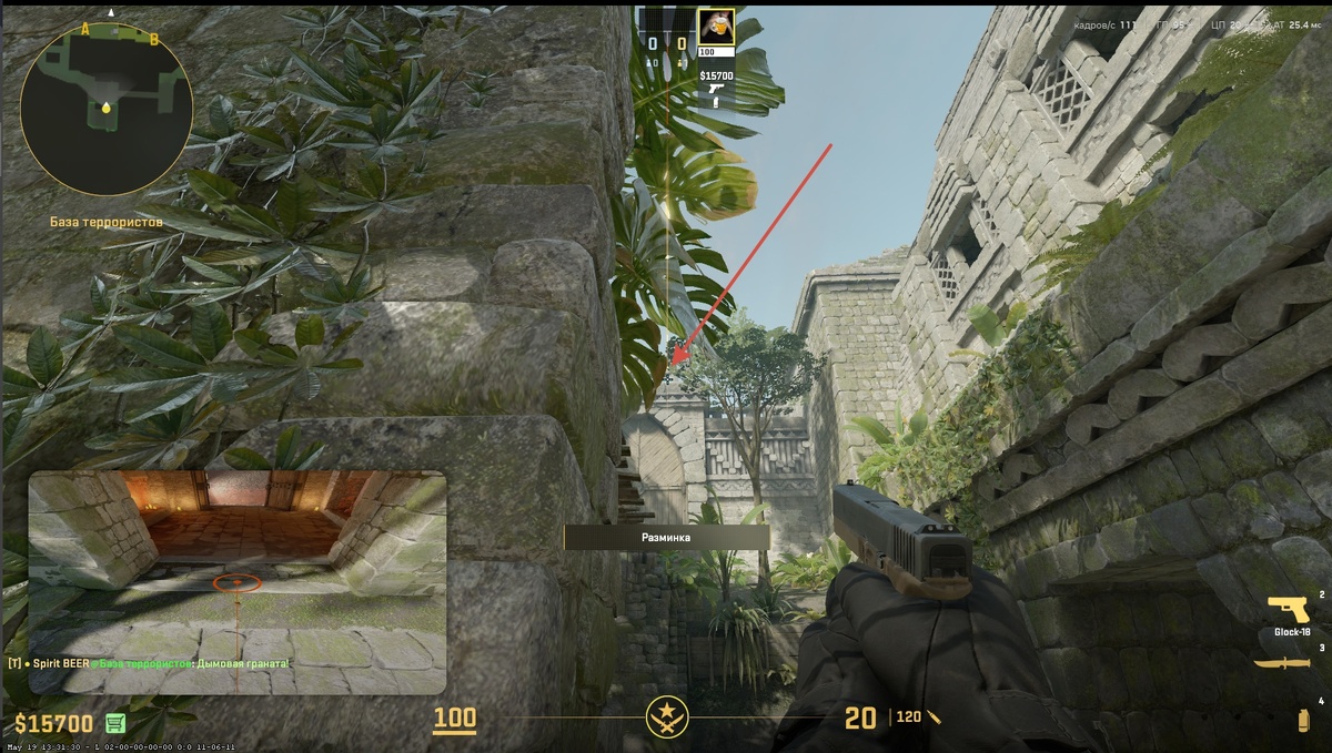 Важные смоки на миду – в окно и в бублик: Первый смок – дефолт на любых рангах, который позволит драться за мид, давить пончик и залезть на хэвен. Вторая граната поможет прожать мид для последующего пуша или для его зонирования. Три главных смока на А точку – в храм, бублик и кт: