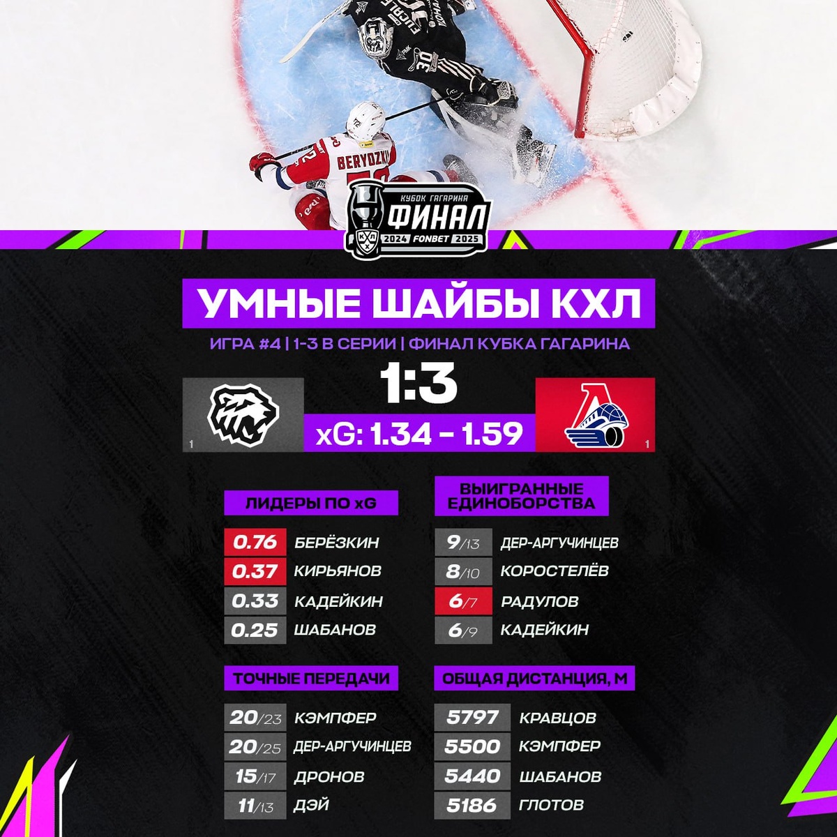 KHL.ru разбирает четвертый матч финала Кубка Гагарина через призму умной статистики. И вот что интересного удалось выяснить! 😉 «Локомотив» снова начал матч мощно! 💥 По показателю ожидаемых голов (xG) ярославцы создали моментов на 1,59, а «Трактор» — всего на 1,34. «Трактор» снова впереди по пробегу — 70,47 км против 65,22 км у «Локомотива». 🏃♂️ Пятый матч — 21 мая в Ярославле! 🏟️🔥 Кто возьмет верх и сделает шаг к Кубку Гагарина? Будем следить! 👀 #КХЛ #Хоккей #Локомотив #Трактор #КубокГагарина