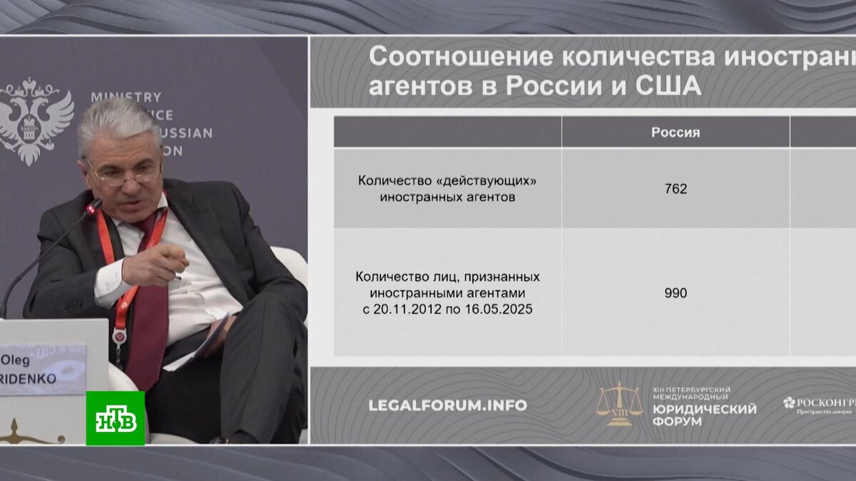 Олег Свириденко, замминистра юстиции РФ: «У нас с 2012 года по 2025 990 субъектов, могу ошибиться на 2–3, а в Америке за 10 тысяч за тот же период времени. И как вы понимаете, большая часть — добровольцы. Интересно, а почему они сами спешат быстренько в этот список? Да потому что там уголовная ответственность, которая применяется. Для них очень непросто, поэтому проще прийти и зарегистрироваться добровольно. Эту уголовную ответственность нужно вводить, хватит нянчится с этими субъектами, которые ничего хорошего для нашей страны не приносят».