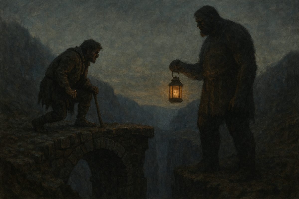 На этом путник не остановился. На следующий день, когда группа людей, с виду беженцев, пытались пересечь мост, он встал поперёк дороги, предупреждая их о том, что за мостом — вымогатель, который обдерёт их до нитки и не пропустит. Сам вымогатель же убеждал их в обратном, как мог, но в нервно прыгающих из стороны в сторону глазах беженцев читался параноидальный страх, так что они почти сразу же ушли искать другой путь.