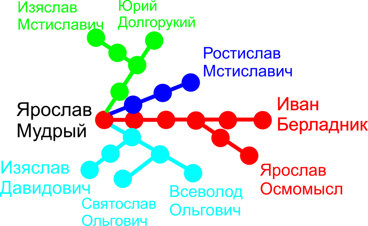 Проживал персонаж во времена неспокойные и в местах таких же. Так ещё род его изгойский. Как начал дедушка скитаться, да в приживальщиках ходить, так и пошло поехало. Придётся немного про происхождение написать. Рюрикович, естественно. Ярослав Мудрый ему приходится дедом с тремя пра. Небезызвестный Ярослав Осмомысл (Что означает аж восемь мыслей в голове) двоюродным братом. Ну, и из "близких" к нам Юрий Долгорукий приходится герою седьмой водой на киселе. Что-то типа четвероюродного дедушки. К середине двенадцатого века потомки Рюрика расплодились необычайно. Составлю-ка пояснительную картинку с родственниками, которые здесь упоминаются.